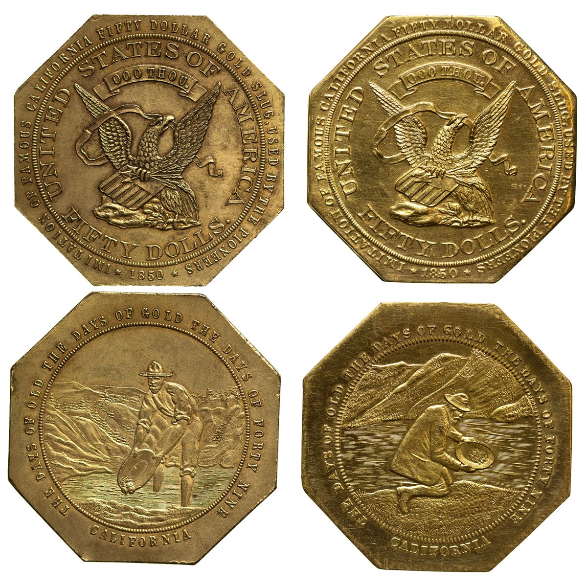 Lot of 2. 1850 $50 Dollar Gold Piece on obverse, Days of the Forty Nine w/ Gold Panner (left facing) on reverse. Same as previous, with Gold Panner (kneeling facing right) on reverse. Both in excellent condition.