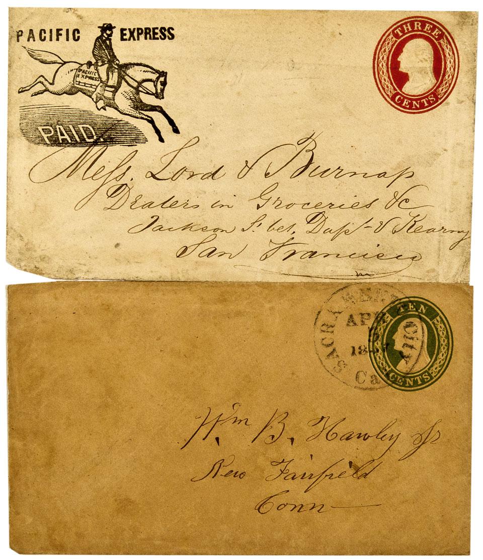 Lot of 2: 1) U7 3 cent red on white envelope with Pacific Express frank with pony. Addressed to Lord & Burnap, dealers in groceries on Jackson Street between Dupont and Kearny, San Francisco. Back flap missing. Chip, lower left corner. 2) Strong Sacramento single ring cancel on U18 cover, no frank. Dated 1857.