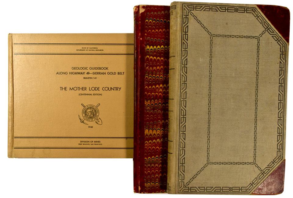 Lot of 3: 1) Geologic Guidebook Along Highway 49 - Sierran Gold Belt, Bulletin 141. The Mother Lode Country (Centennial Edition), 1948. State of California Department of Natural resources, Division of Mines, Ferry Building, San Francisco. Hardcover, indexed, 164 pages including numerous photographs, maps, and illustrations. Addressed "To His Excellency The Honorable Earl Warren, Governor of the State of California." 2) Ledger book, 7 1/2" x 12 1/2". About 25% of pages used, the rest blank. Dates typically listed around 1887. Information includes: client names, dates, services or items sold, and money collected. 3) Ledger book with dates from 1905-07. Headings include: Assay Expense, Balance Sheets, Cash and Expenses, Company Organization, Mine Supplies & Powder, and Patent Expense (provisions, groceries, board supplies). Approximately 10% of pages used. Also included is information pertaining to the Braganza, originally called Broganza, mine claims. Patented in 10/30/1906, it is located in Summit County, in the Peru mining district.