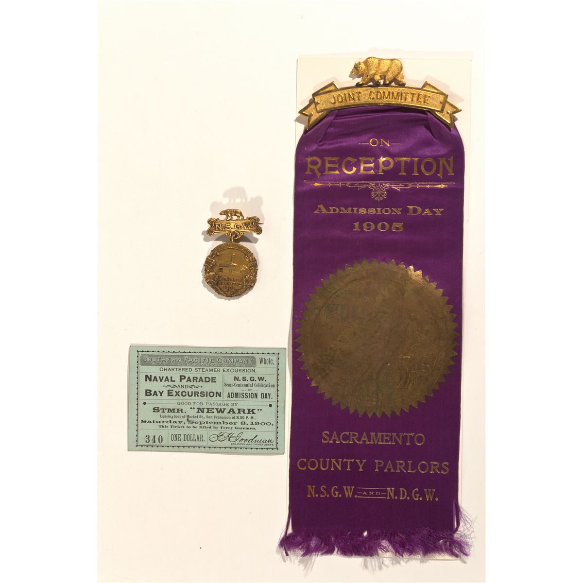 Lot of 3. 1) Joing Committee pin with large purple ribbon from Sacramento County Parlors for N.S.G.W. and N.D.G.W. Embossed with California State seal. 2) small N. S. G. W. Pin back delegate badge for Grand Parlor, Monterey, April 24th, 1905 (made by Shreve & Co. In San Fran) 3) Southern Pacific Company ticket for chartered steamer excursion for Navay Parade, Bay Excisions and N.S.G.W. Semi-Centennial Celebration of Admission Day, dated stamp on reverse Sept 8, 1900.