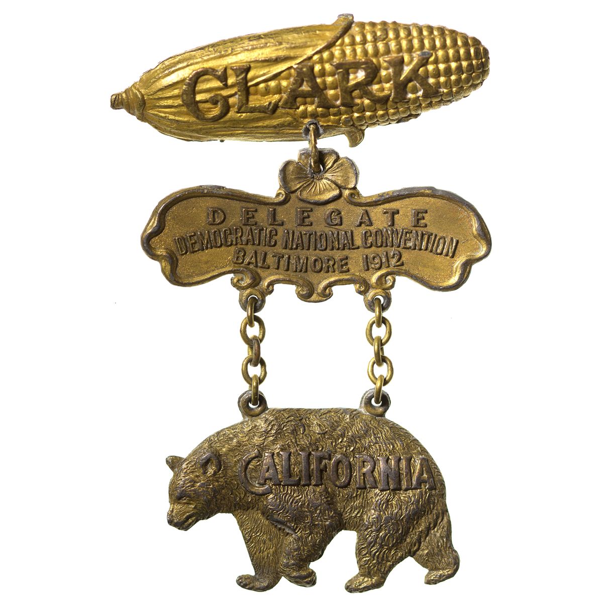 Pin measures about 3.5” x 2.5.” A corn cob with the name Clark is on the top, along with a California bear on the bottom. In the middle reads “delegate. Democratic National Convention Baltimore 1912.” Made by Irvine & Jachens in San Francisco. Some wear. - Weber Collection