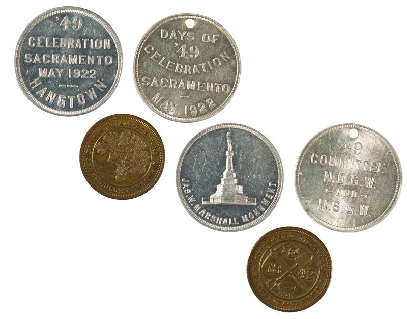 Three medals: NSGW Days of '49 Celebration, Sacramento, May, 1922; 2) Hangtown Jas W. Marshall Monument, 1922, aluminum; 3) First Gold Discovery Placerita Canyon, bronze, uncirculated, 31mm, Newhall California.