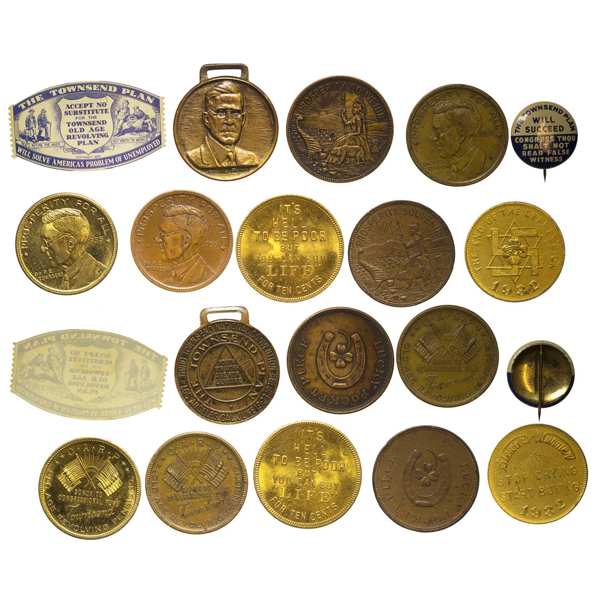 Various 1930s tokens and button with Depression Era slogans, "Townsend Plan." - Weber Collection