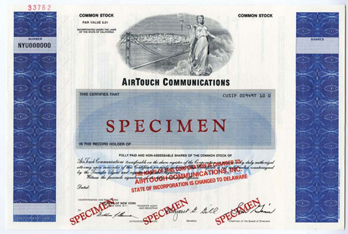 CA. AirTouch Communications, Odd Shrs Common Stock Specimen Certificate, XF ABNC. AirTouch Communications was a U.S.-based wireless telephone service provider, created as a spin-off on Pacific Telesis on April 1, 1994.