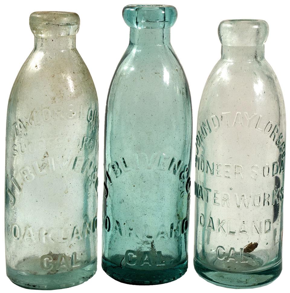 Lot of 3 different aqua Hutchinsons. 1) Taylor & Lohse, Successors to J.I. Bliven & Co. Oakland, Cal. is embossed on the side, and Made By Gravitating Stopper is one the base. Measures 7” tall. 2) John Taylor & Co., Pioneer Soda Water Works, Oakland, Cal. 7” tall. 3) J.I. Bliven & Co. Oakland Cal. Slightly deeper color and the first two and slightly taller (7 ¼”). This one also has Made By Gravitating Stopper embossed on the base. Rare.