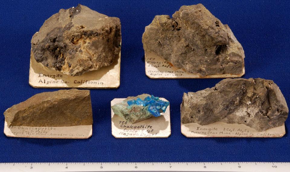Lot of 5. 1) Chalcanthite, Mojave Desert. 2) Chalcopyrite, Copper Hill mine, Amador County. 3) Two of Enargite, Morning Star mine, Alpine County. 4) Enargite, Alpine County.