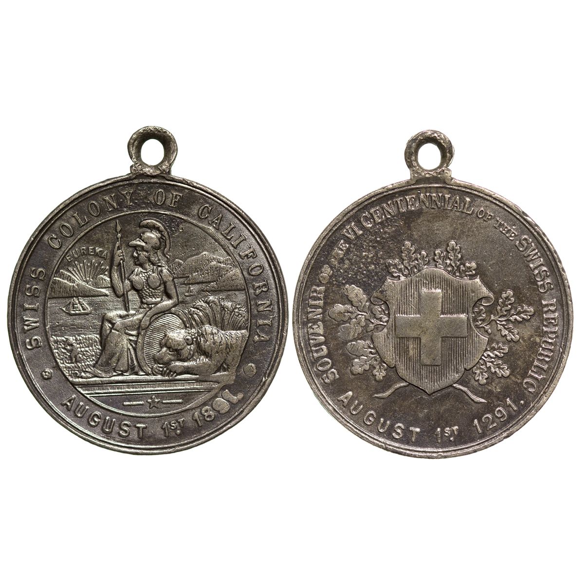 Obverse, seal of California. Reverse, Swiss seal and reads "souvenir of the VI Centennial of the Swiss Republic. August 1st, 1291.Some wear. - Weber Collection