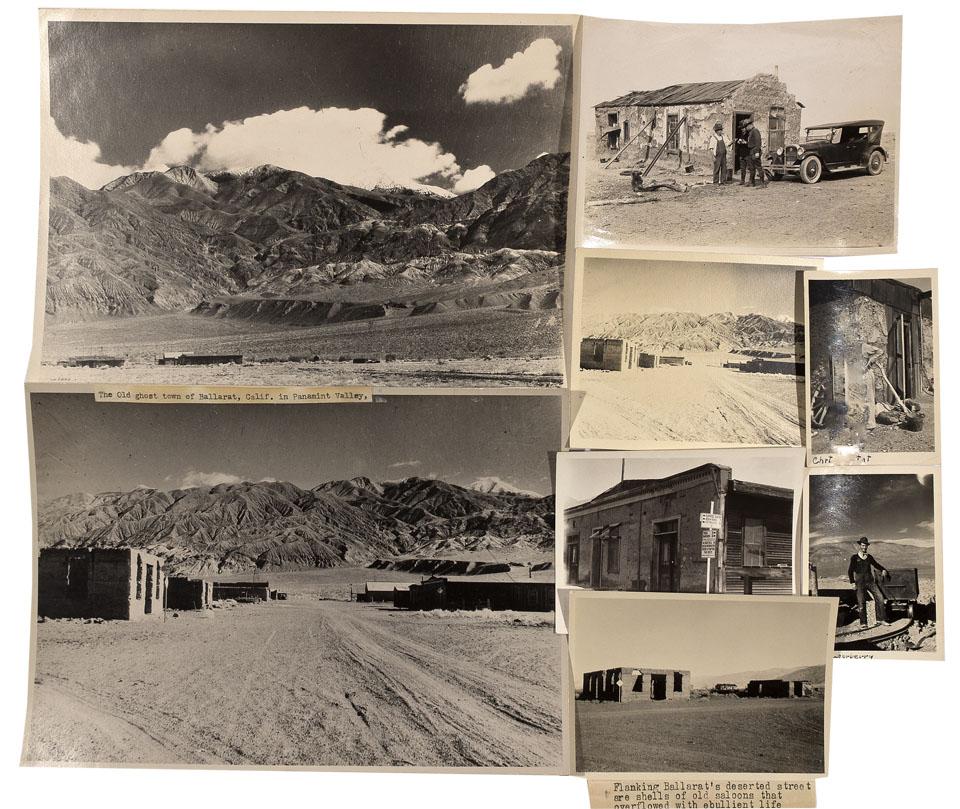 Lot of 8 real photos of Ballarat in the early part of the 20th century. Two are 8 x 10”; one shows the deserted main street and the second shows the town at a distance, at the foot of the Panamint Mountain Range. The remaining smaller snapshots show: a deserted adobe house, 3 men (“Short Harris” is named) standing in front of an early touring car, in front of a dilapidated adobe building (the near wall is propped up by boards), old adobe saloons standing vacant on a dirt street, main street scene (smaller version of one of the large photos), and two snapshots of residents or prospectors—Chris Wicht and Pete Augerberry. The town had its beginning just about the turn of the last century—1897—as a supply point for the mines in the Panamint Mountains. It was given the name by George Riggins, an Australian miner, who took the name from the mine in his country where the first gold was discovered in 1851 and where the largest nugget in the world was discovered, weighing about 143 pounds. The major mine near the “new” Ballarat was the Radcliff, which produced 15,000 tons of gold ore between 1898 and 1905. Within a year or two, Ballarat could boast of 7 saloons, 3 hotels, a Wells Fargo station, post office, school, and jail—but no churches. Several legendary characters called the town home—one of whom was Frank “Shorty” Harris (note photo above), as well as “Seldom Seen Slim,” and Wyoming gambler and gunman Michael J. “Jim” Sherlock. When the Radcliff suspended operations in 1903, the town’s demise began. Other mines followed the Radcliff’s departure and by 1917 the post office was closed. Shorty Harris stayed there until he died in 1934. Seldom Seen Slim (aka Charles Ferge) was the last of the old time prospectors to live in Ballarat, calling himself “half coyote and half wild burro.” He died in 1968, and those words were engraved upon his tombstone. In the 1960s Neil Cummins bought land east of Ballarat to create a tourist mecca, even building a cinderblock store and setting up a trailer park, but had to give it up in 1988 when all his efforts failed to bring visitors. Today Ballarat is a virtual ghost town, although there remain a few stalwart residents [Ref: www.legendsofamerica.com/ca-ballarat.html].