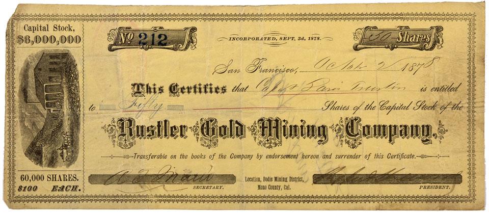 Incorporated September 3, 1878; Certificate No. 212 issued October 2, 1878 to Captain Paris Tustin (?) for 50 shares; signed by illegible President and A. F. Main (?), Secretary; no printer; U/C. The Rustler Gold Mining Company, which lies squarely on the main ore belt that traverses the Bodie District, was developed by means of a vertical shaft. Investors expected the mine to produce rich ore. The investors in this mine also invested in the Ajax Gold & Silver Mining Company including A. F. Main and was incorporated in September 1878. This certificate is moderately decorated along the border and includes an illustration of a mill with a horse-drawn cart hauling ore to the mill. Two assessment stamps are on the reverse of the certificate, one from Aug 1 1879 and the other from Nov 22, 1879 in the Carson City Bank. [Information about this company from United States Annual Mining Review and Stock Ledger: Containing Detailed Official Reports of the Principal Gold and Silver Mines; A History and Description of Mining and Stock Dealing, with Biographical Sketches of the Principal Men Engaged Therein, 1879] Two pieces known to us. This is the first time at auction.