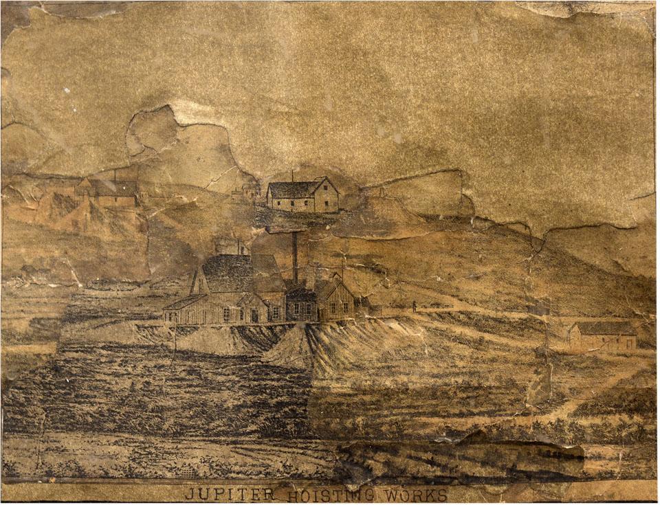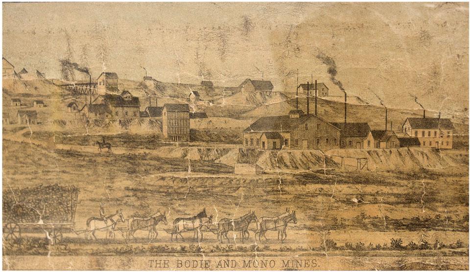 The height of the Bodie boom took place around 1880, the year this piece was produced. According to some estimates, the population reached 10,000 at the town's peak, which "supported between forty and fifty mines and ten mills, aggregating 162 stamps…"[Ref: Gudde, 1975, pp. 42] "The official returns from the mines of this county show an excess of production over any other county...This large yield of nearly $3,000,000 is reported by nine mines. In Bodie district are the chief mines of the county and some of the largest in the state. There are returns from from the Standard Consolidated, Bodie Consolidated, Bulwer Consolidated, Noonday, and North Noonday. The Standard Consolidated is this year the banner mine of California, standing at the head of its many famous mines" [Ref: Burchard, 1880, pp.38].
