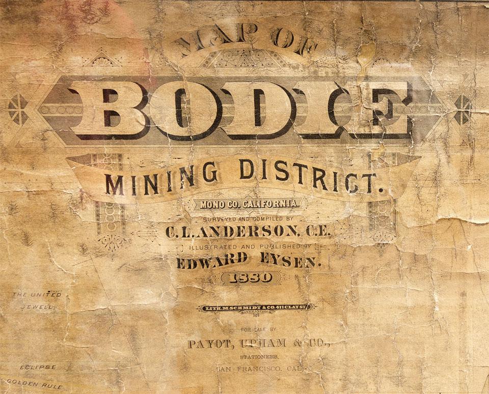 This spectacular wall map is arguably one of the most sought-after pieces from Bodie. We were only able to find four such pieces in either private or institutional collections, including this one. This classic "Map of/Bodie/Mining District/Mono Co. California/ Surveyed and Compiled by/C.L. Anderson, C.E./Illustrated and Published By/Edward Eysen./1880/Lith. M. Schmidt & Co. 411 Clay St./San Francisco/For Sale By/Payot, Upham & Co.,/Stationers,/ San Francisco, Cal." The main body is a plan view map of various claims and mill sites at a scale of 1" = 300'. Printed near the lower right corner is "Notice/Claims only which have been properly located on/the ground and surveyed are represented on this map./A table published separately from this map gives/the dates of Location and Record for each claim./Numbers marked near Shafts, Peaks, etc., indicate the altitudes of the respective localities in feet." This indicates that the author of the map used only those claims surveyed by a US Mineral Surveyor. Near the upper center of the main body is noted: "We certify we have examined this map/and have found the respective claims we represent/to be correctly shown," followed by the signature of 12 mine superintendants covering a total of nearly 30 mines.