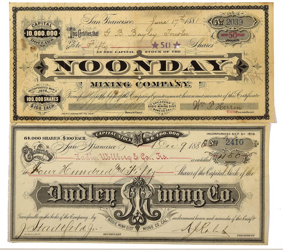 Lot of 2. 1) Noonday Mining Company. Incorporated in 1878. Cert. #2039 issued on June 17, 1881 to G. B. Bayley, Trustee for 50 shares. Signed by secretary illegible and vice president F. Herrin. No vignette, but fancy black text throughout. Black border, and red highlighted text for share numbers and vice president. U/C. Stock printed by Lith W. . Galloway. Certificate measures 9" x 4". 2) Dudely Mining Company Stock. Incorporated in 1878. Cert. #2410 issued on December 9, 1886 to Ladig, Wollberg & Co., Trs. For 450 shares. Signed by secretary J. Stadtfeld, J. And president (illegible). Mining company name printed in intricate text with detailed "M" in center of the certificate. Printed in black with black border. Red text highlighting the recipient of the stock. UncancelU/Cd by Lith, Britton & Rey. 9" x 4".