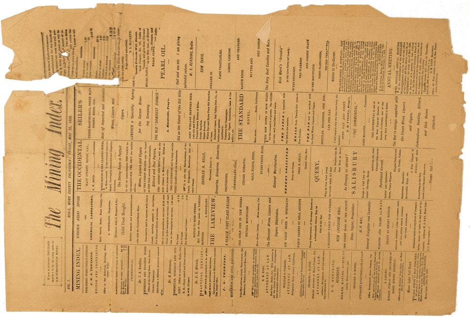 Ultra Rare. The Bodie Mining Index. The Editor and Owner of this newspaper J. Townsend, earned the nickname "Lying Jim Townsend" while working for the Territorial Enterprise in Virginia City, where he also became acquainted with Samuel Clemens, AKA Mark Twain. Townsend's colorful career lead him to write for and manage other newspapers including the Reno Gazette, the Miner's Index in Lundy and the Golden Era in San Francisco where he met Bret Harte, who modeled his Truthful James story after Townsend. Others have maintained that Twain's character in his famous "Jumping Frog of Calaveras County" story was also modeled after Townsend. This publication is saturated with advertisements, promotions, and acclamations for local Bodie businesses. Establishments would promote their services head to head against their competitors. For instance The Occidental Hotel promotes themselves as the leading hotel in Mono County, boasting about their newly renovated and refurbished rooms. Scanning down the page, The Standard Hotel also strongly argues about their unbeatable meal prices, fantastic deals on wine and liquor, and only employing the best obtainable staff.  Despite having damage in the right upper corner. Fair condition.