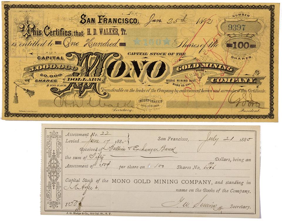 #1: Incorporated on August 17th, 1878; Certificate No. 9397 issued January 25, 1892 to H.D. Walker Tr. For 100 shares; illegible signatures; printed by Galloway Litho, S.F; "sold for Asst" written on face with red ink. #2: Assessment receipt No. 22 issued July 21, 1885; received from Bullion and Exchange Bank for $50 as assessment on 100 shares of capital stock of the Mono Gold Mining Company; signed by G.W. Sessions; printed by J.G. Hodge & Co. 314 Cal. St., S.F.