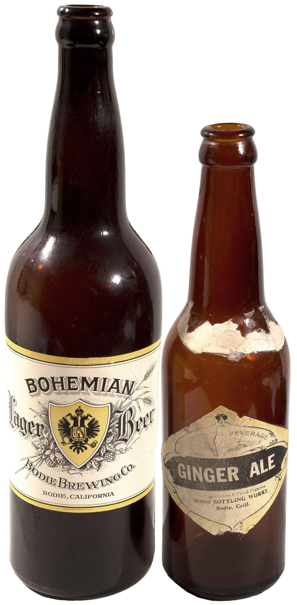 Lot of 2. The first bottle is a rare piece in super condition. This is an amber quart crown top beer with a 100% perfect label. The label reads: Bohemian Lager Beer Bodie Brewing Co. Bodie, California. A white label with yellow border and shield. Great Condition, could be unique. The second bottle is a labeled pint amber beer. The label is faded and about 80%. It reads: Ginger Ale Mono Bottling Works, Bodie, Calif. Two great pieces for the serious Bodie collector.