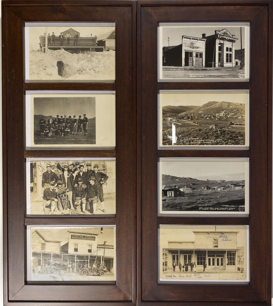 Eight post cards of Bodie. All white border RPG’s. The post cards are separated into two wood frames. Two show the Bodies Mutts, the mining town’s baseball team. Which was a popular form of entertainment for Bodie residents. Four show Bodie’s downtown’s including the outside of the Moyle and Bros. General store and the post office. One even shows a store with snow piled up to the roof. The last two show a large view of the town. Three post cards were produced by Frasher Fotos in Pomona, CA. Little wear, two post cards have writing in blue and black ink on the front. Six have yellowed slightly from age.