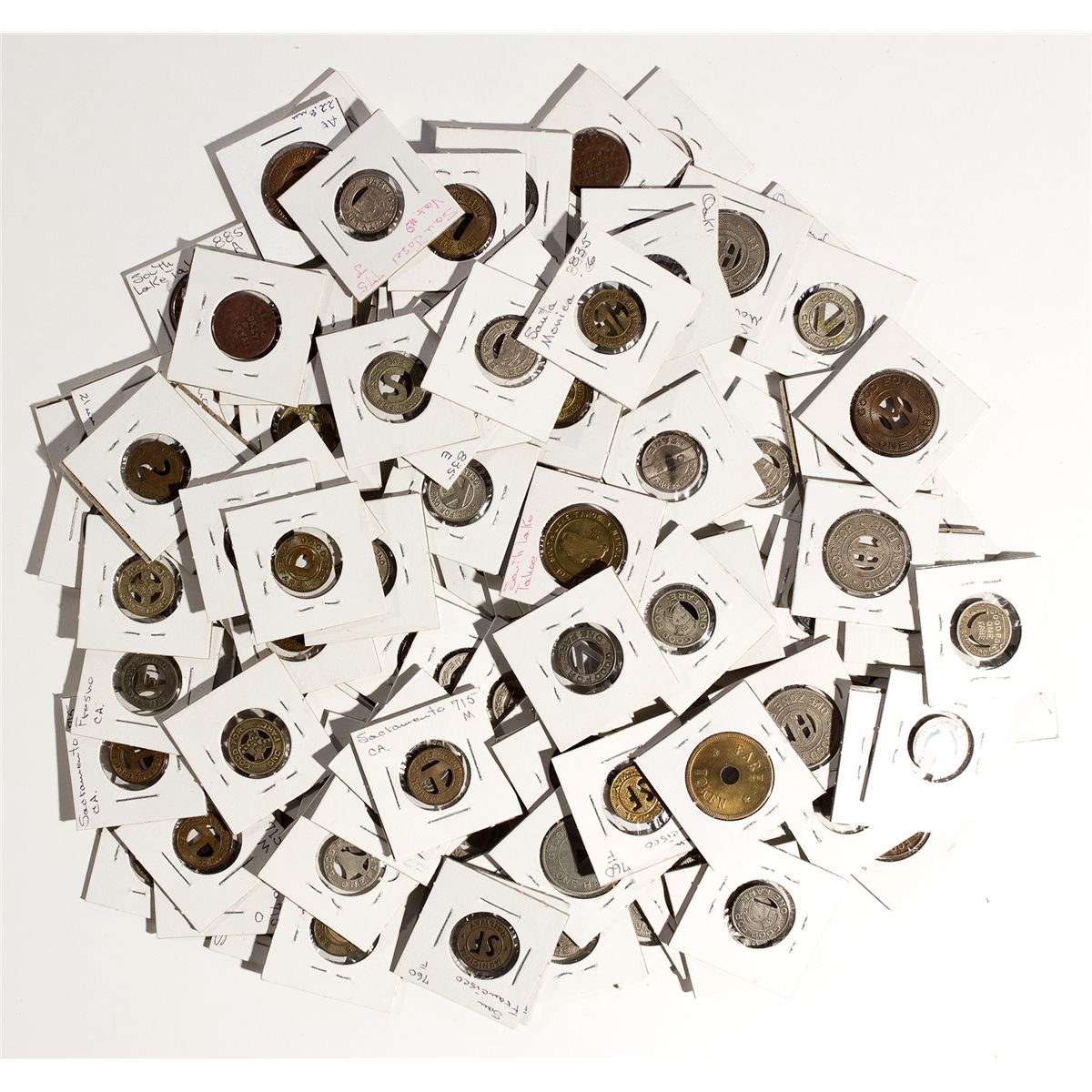 Lot of 118. Multiple California City Transportation Tokens, from the cities of Oakland, Carmel, San Jose, San Francisco, Vallejo, Sacramento, Santa Cruz, Santa Monica, Los Angeles, etc. - Weber Collection