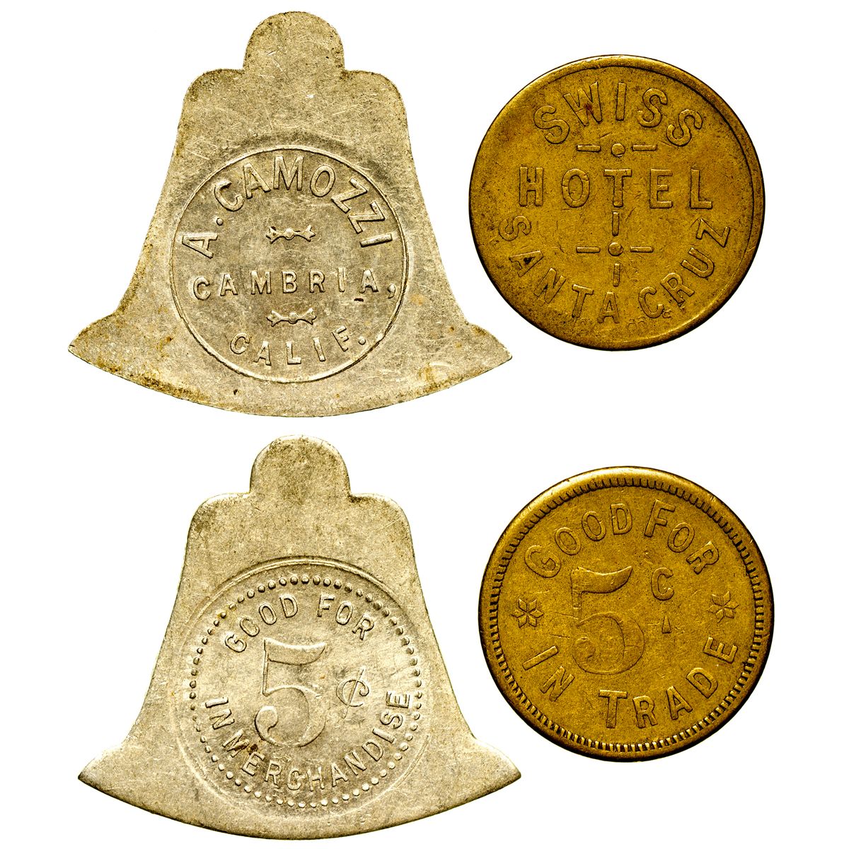 Lot of 2: 1) Cambria, A Camozzi. GF5cIM. Bell shaped. VF. 2) Santa Cruz, Swiss Hotel. GF5cIT. VF.