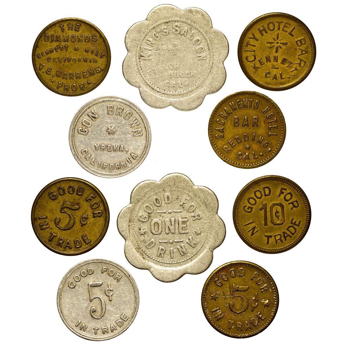 Lot of 5. 1) French Gulch, King's Saloon. GF1D. Scalloped. Good. 2) Kennett City Hotel Bar. GF10cIT. XF. 3) Kennett & Hilt, The Diamonds. GF5cIT. VF. 4) Redding, Sacramento Hotel Bar. GF5cIT. Fine rev. Scratches. 5) Yreka, Con Brown. GF5cIT. VF. The story of the initial discovery in Yreka by Abraham Thompson and his group is that the grasses being pulled from the ground by the pack mules for food showed gold flecks on their roots. Six weeks later, in 1851, 2000 miners worked the Yreka Flats [yrekachamber.com]. Major discoveries throughout Gold Country led to camps springing up all over Northern California.