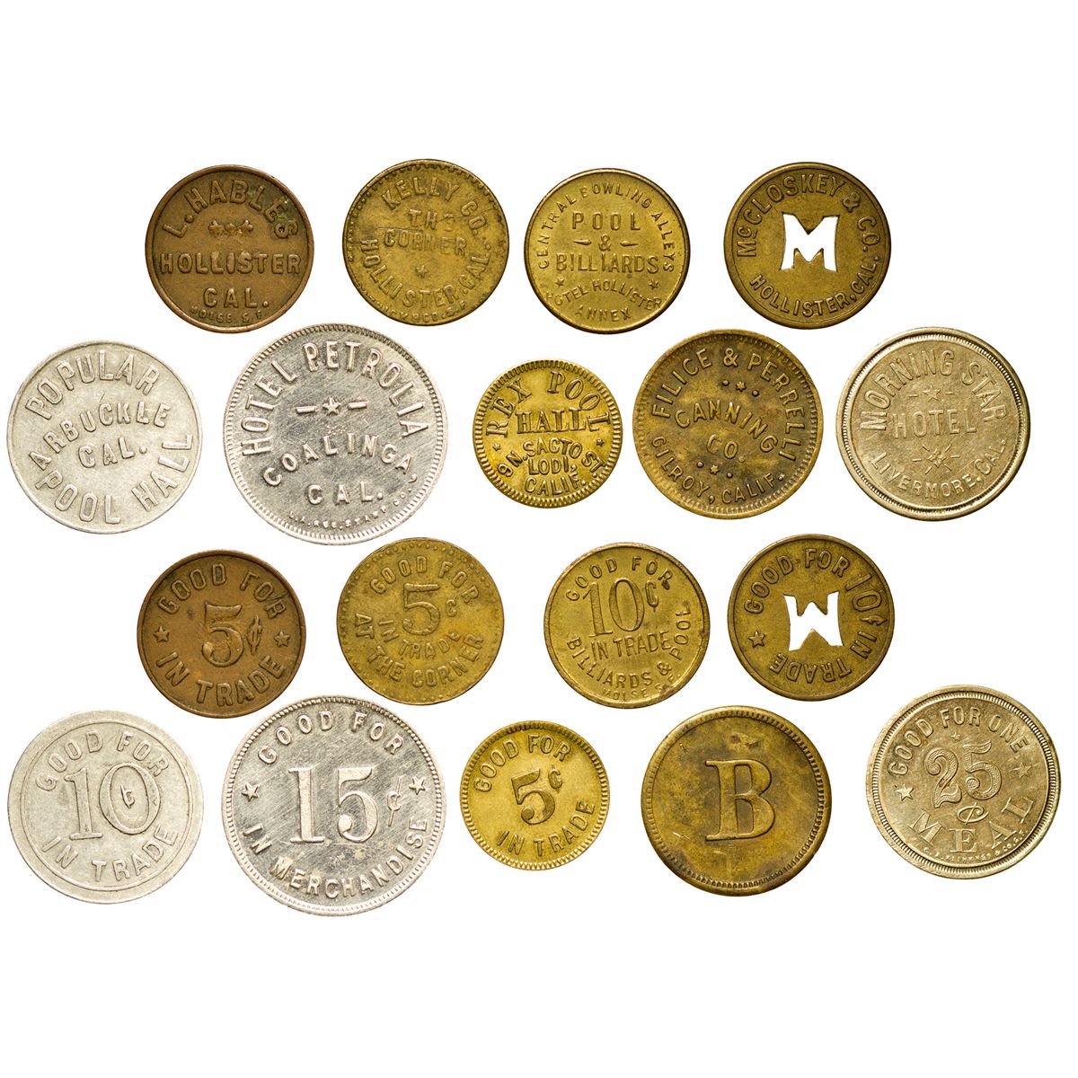 Lot of 9. 1) Arbuckle Popular Pool HallGF10cIT. Fine. 2) Coalinga Hotel Petrolia. GF15cIM. AU-Unc. 3) Gilroy, Filice Perrelli Canning Co. B. Fine. 4) Hollister, Hotel Annex Pool & Billiards. GF10cIT. VF. 5) Hollister, Rex Pool Hall. GF5cIT. VF. 7) Hollister, L. Hables, GF5cIT. VF. 8) Hollister, Kelly Co. The Corner. GF5cIT. Fine. 9) Lodi, Rex Pool Hall. GF5cIT. VF. Livermore, Morning Star Hotel. GF25c Meal. AU. Hollister was established in 1872 by ranchers and farmers. It lies in San Benito County [hollister.ca.gov].