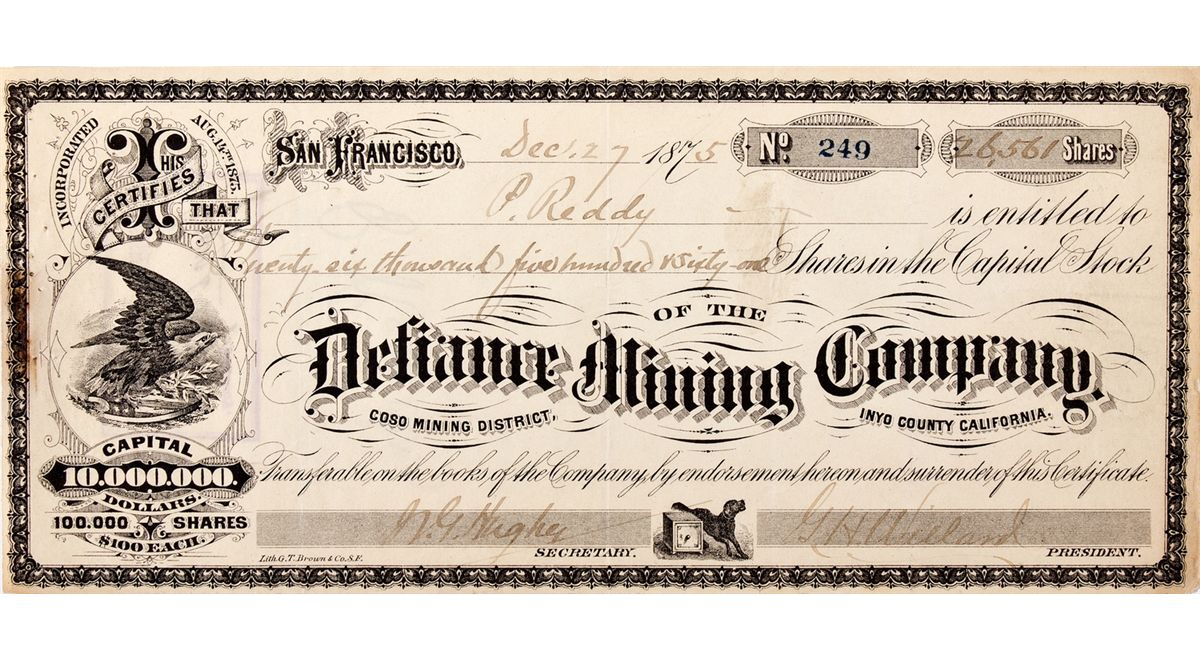 This certificate is a major piece for any Inyo collector. The Defiance mine was one of the most important mines at Darwin, if not the most important of the period, mined nearly continuously until WW2 (by the Anaconda Company). This piece is issued to none other than Pat Reddy, the infamous one-armed, heavy handed lawyer who rough-housed his way into control of most of the region's mines (except the Yellow Aster- Rose Burcham wouldn't let him in the door). It is signed by Reddy on the reverse, a are signature for western collectors. The certificate is made out for 26,561 shares, representing more than a quarter of the company. The document is in very good condition. Litho/Printed by African American G.T. Brown. This may be the first Defiance piece we've seen signed by Reddy. See Palazzo's biography of Reddy online at Explore Historic California, Feb. 2012 issue.