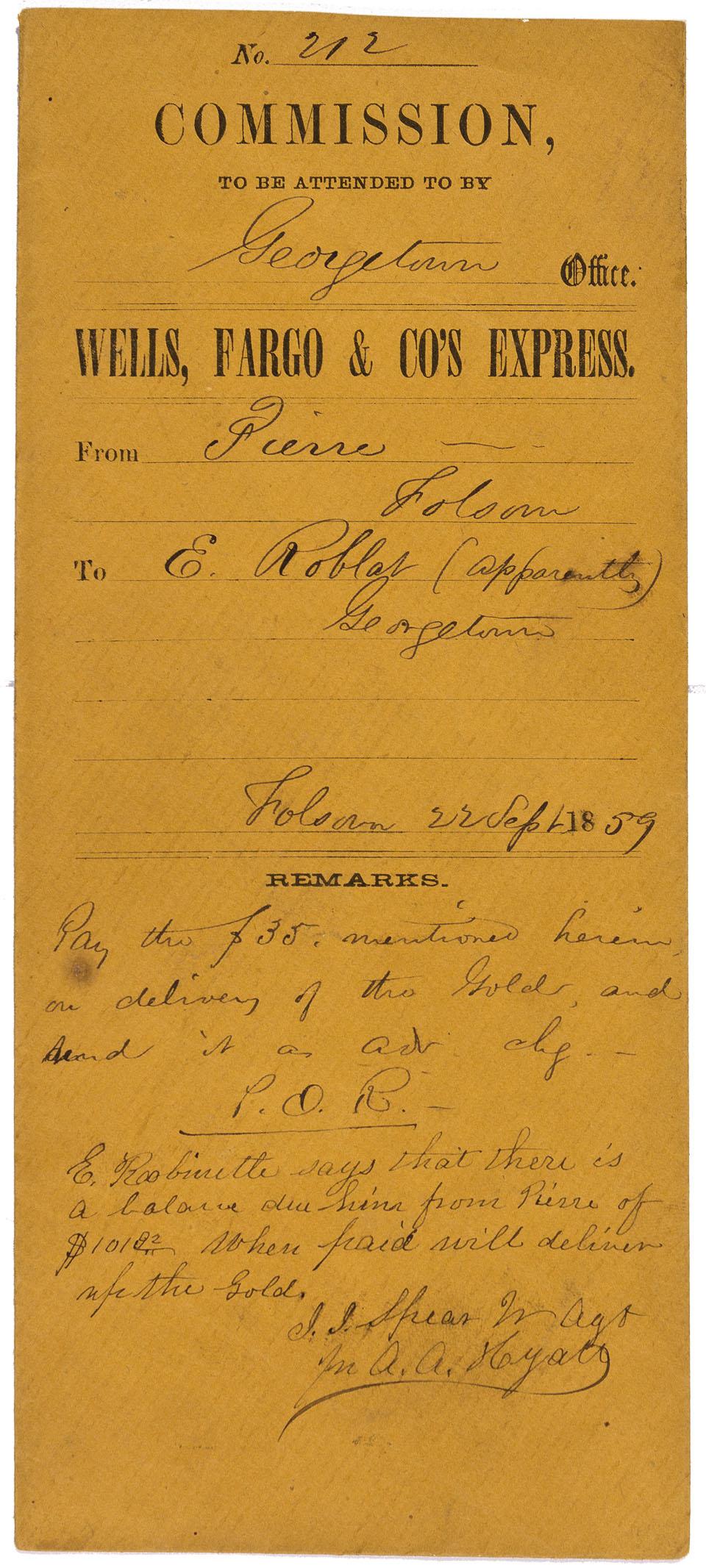 Printed on one side of the envelope is: No. 212. Commission to be attended to by Georgetown Office. Wells, Fargo & Co’s Express. From: Pierre (in) Folsom to E. Roblat (apparently) Georgetown. Folsom, 22 Sept. 1859. Remarks. “Pay the $35 mentioned herein on delivery of the Gold, and send it as act chg.     P.O.R.  E. Robinette says that there is a balance due him from Pierre of $101.92. When paid will deliver up the Gold. (Signed) I.I. Spear, W. Agt for A.A. Wyatt.”