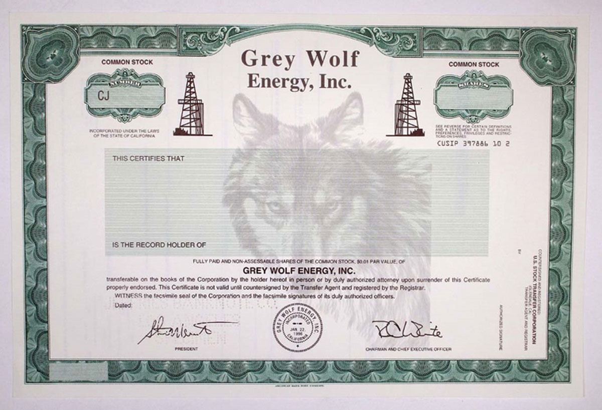 CA. Grey Wolf Energy, Inc. 1996 Specimen Stock Certificate XF ABN Oil & Gas. Grey Wolf Exploration Inc. explores, develops, and produces crude oil, natural gas, and natural gas liquids in Canada. It principally held interests in the Caroline, Knopcik, Pouce Coupe, Valhalla, Widewater, Ladyfern, and Petitot properties. Grey Wolf Exploration Inc. was formerly known as Cascade Oil & Gas Ltd. and later changed its name to Grey Wolf Exploration Inc. in June 1998. The company was founded in 1993 and is based in Calgary, Canada. As of July 24, 2009, Grey Wolf Exploration Inc. operates as a subsidiary of Insignia Energy Ltd.