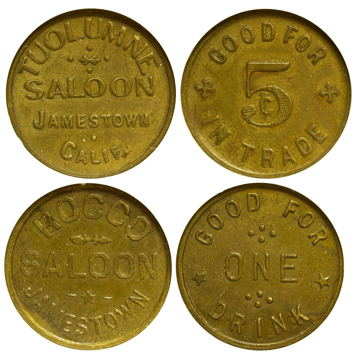 Lot of 2 including a "Good for 1 Drink" at The Rocco Saloon and a 5 cent credit from Tuolumne Saloon. Both are in very good to excellent condition.