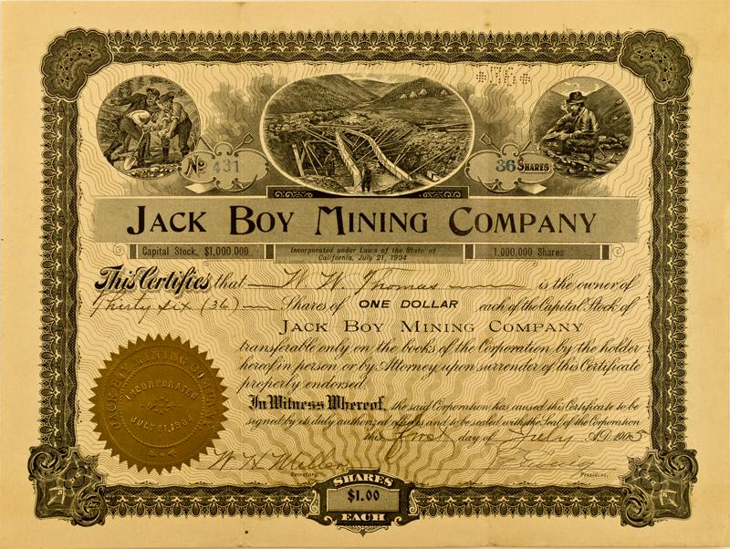 Incorporated in California in 1904. Cert. # 431, issued to W.W. Thomas for 36 shares. Signed by J.E. Ewing, president, and by W.H. Miller, Secretary. Three vignettes across top: Central one of sluice channels under construction; at left is a vignette of 3 placer miners looking at nuggets; and at right a single miner pans in a creek. Black border, gilt safety print and seal, black print. Uncancelled. Printer: Goes. 8 x 10.” The Jack Boy is listed as Corporation #40658 in the 1909 publication of the Compiled Statement of Domestic Corporations and Foreign Corporations, November 1908, pg. 11 [Ref: books.google.com/books].