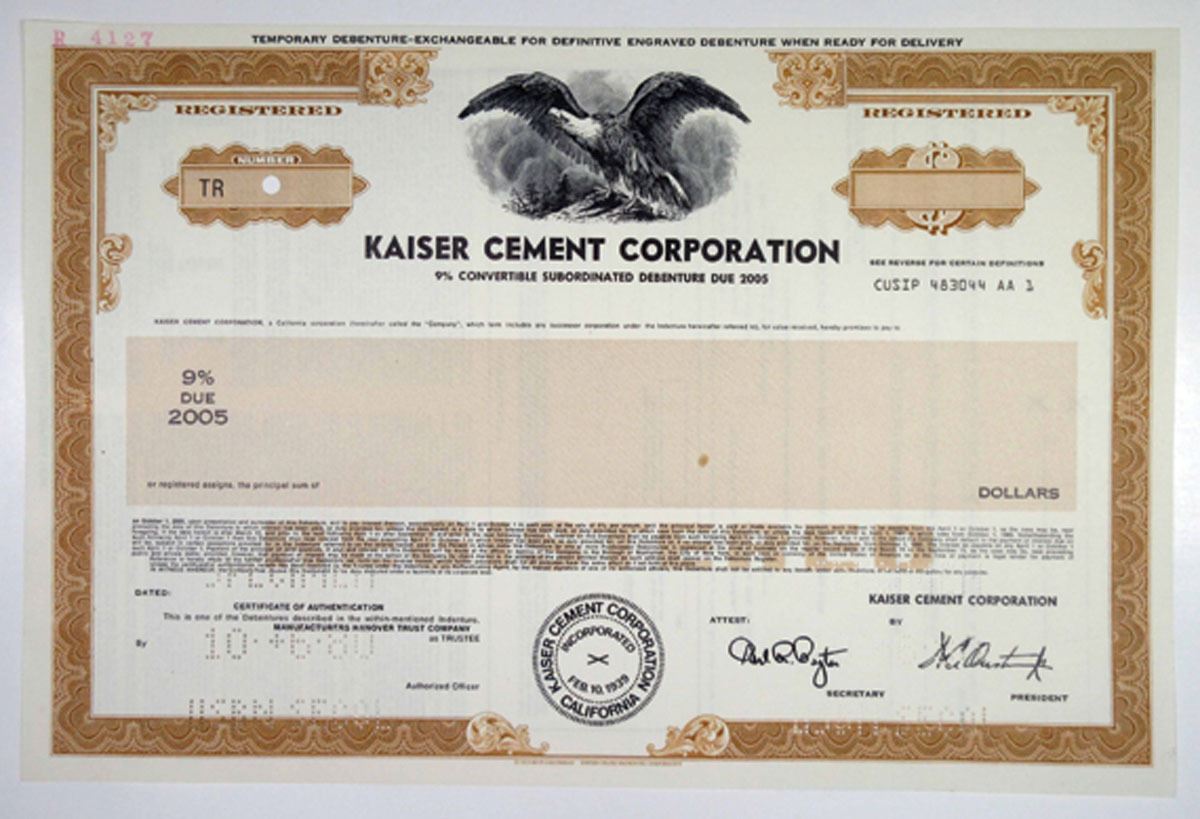 CA. Kaiser Cement Corp., 1980 $Odd Specimen 9% Registered Bond, XF SC-USBN Brown. Specimen Convertible Subordinated Debenture Registered Bond. Kaiser Cement eventually became Hanson Permanente Cement, Inc.