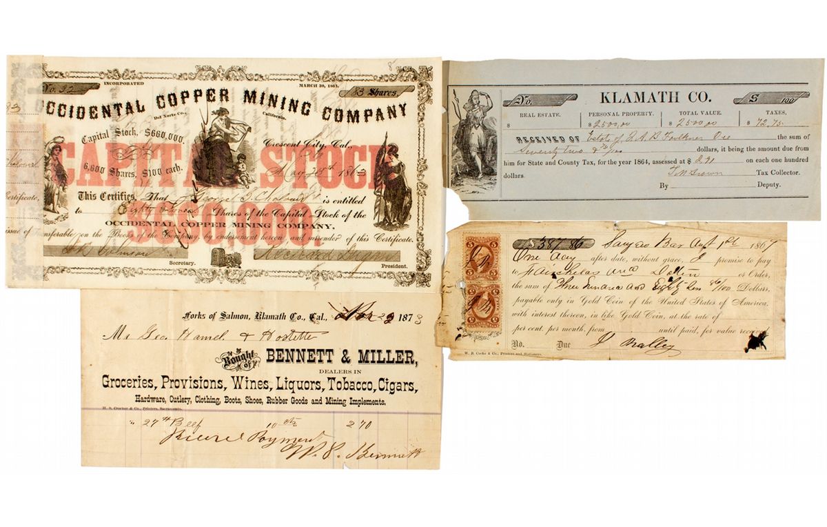 Various California Gold Country ephemera. 1 is a stock certificate, serial No. 32, for Occidental Copper Mining Co. for 83 shares, executed on the reverse in 1863. Measures 12x5.5. 2 is Promissory Note dated April of 1864 for $387. 86. There are 2 Internal Revenue Express stamps affixed on the left side, plus 5 2 cent stamps on the reverse. Measures 8x3. 3 is a receipt for Taxes due from Klamath Co. of a Mr. T.M Brown for the tax year 1864. Measures 8.75x4.75. 4 is a receipt dated 1873 from Bennett Miller, Dealers in Groceries, Provisions, Wines, etc. Measures 8.5x4. All these documents are in good to very good condition. HKA#62827