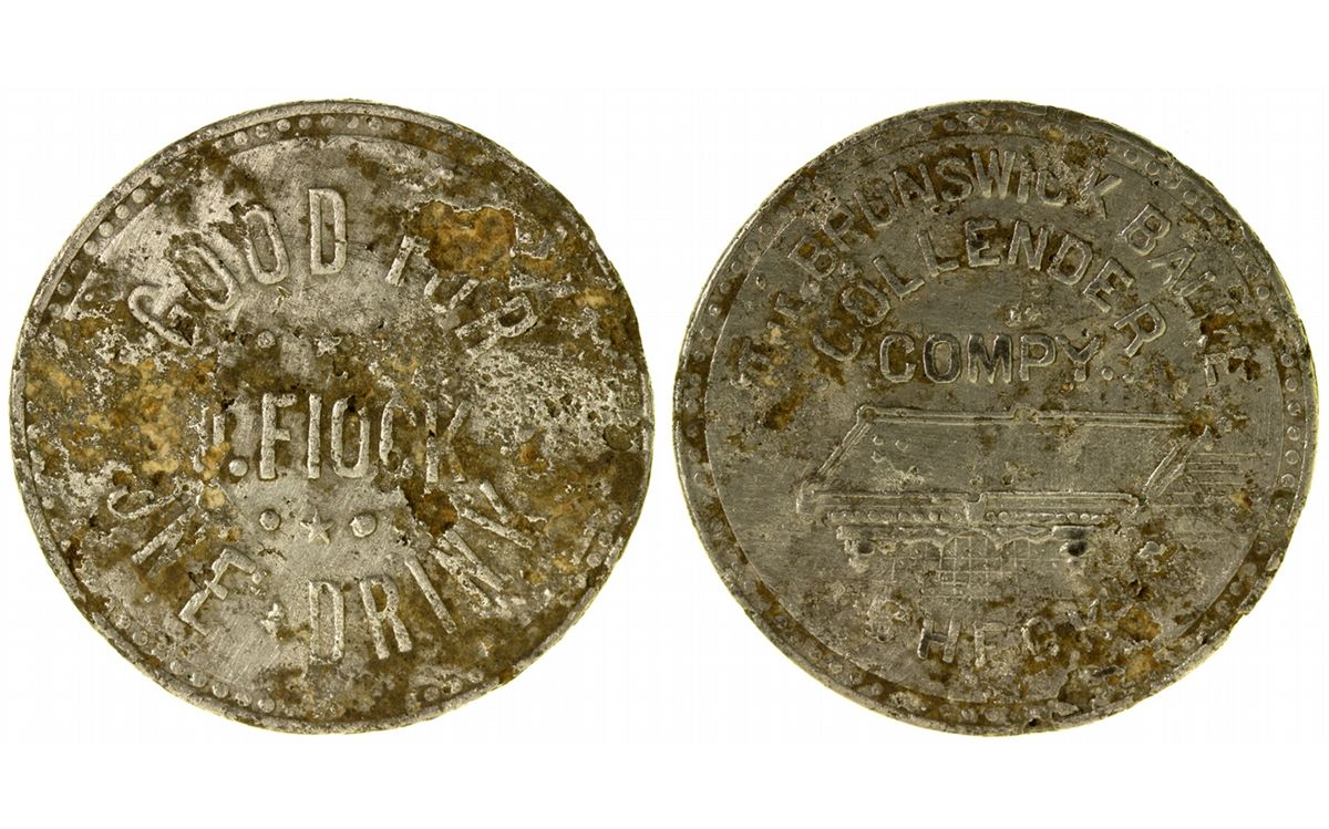 Good for one Drink token. Aluminum token at J. Fiock. The reverse reads, Brunswick Balke Collender Company. Condition is rough, but it is very rare and worth the price. HKA#62708