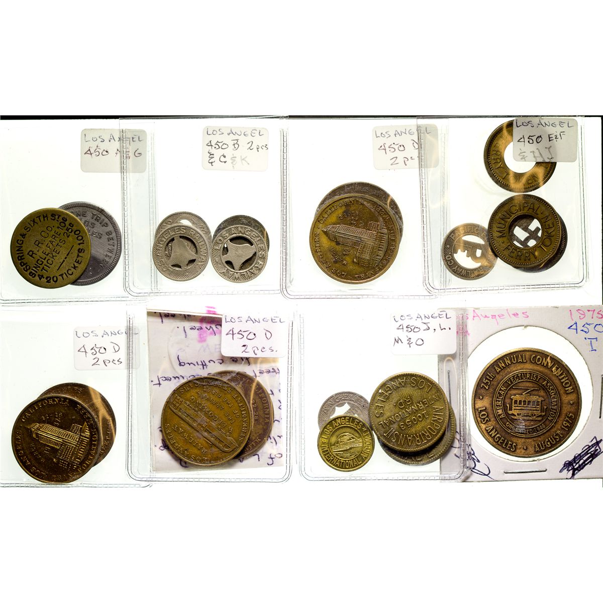 Lot of 21. 1) Atwood, CA 450 A Spring & Sixth ST. R.R. CO. 2) Atwood CA 450 G United States Martime Commission 3) - 5) Atwood CA 450 B (2) & C Los Angeles Railway. 6) Atwood CA 450 K -Los Angeles Metropolitan Transit Authority MTA. 7) -12) Atwood, CA 450 D (6 vars) Los Angeles Streamline Street Cars, (13-14) Atwood, CA 450 E & F - Municipal Ferry Token (15-16) Atwood, CA 450 H & I - Pacific Electric Railway Co. 17) Atwood CA 450 J Los Angeles Transit Lines. 18 &19) Atwood CA 450 L & M - Airport transit Los Angeles. 20) Atwood CA 450 O Los Angeles International Airport. 21) Atwood CA 450 T - 1975 AVA Convention Los Angeles. - Weber Collection