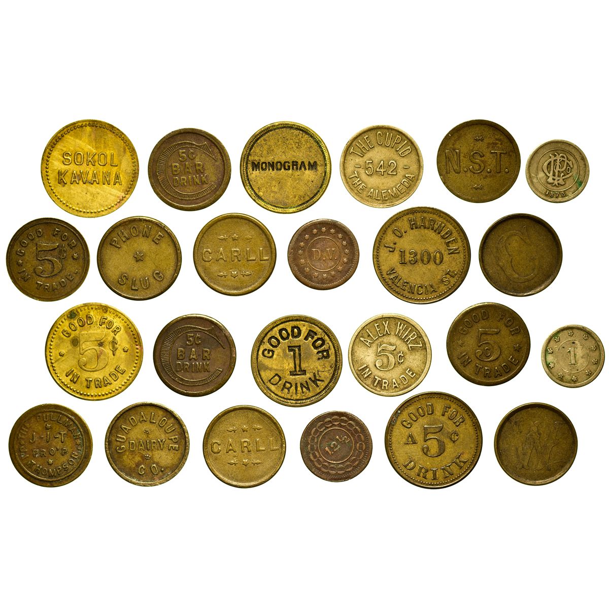 Lot of 12. 1) Monogram. GF1D. Average. 2) 5c Bar Drink. Average. 3) Sokol Kavana. GF5cIT. Average. 4) C & M. Average. 5) 1 1876 Monogram. Average. 6) DV 12 1/2. Average. 7) NST. GF5cIT. Average. 8) Alex Wirz, The Cupid. 5cIT. Average. 9) The Pullman, JIT Thompson. GF5cIT. Average. 10) Guadalupe Dairy. Phone Slug. Average. 11) Carill. Average. 12) JO Harden. 1300 Valencia Street. GF5c Drink. Average.