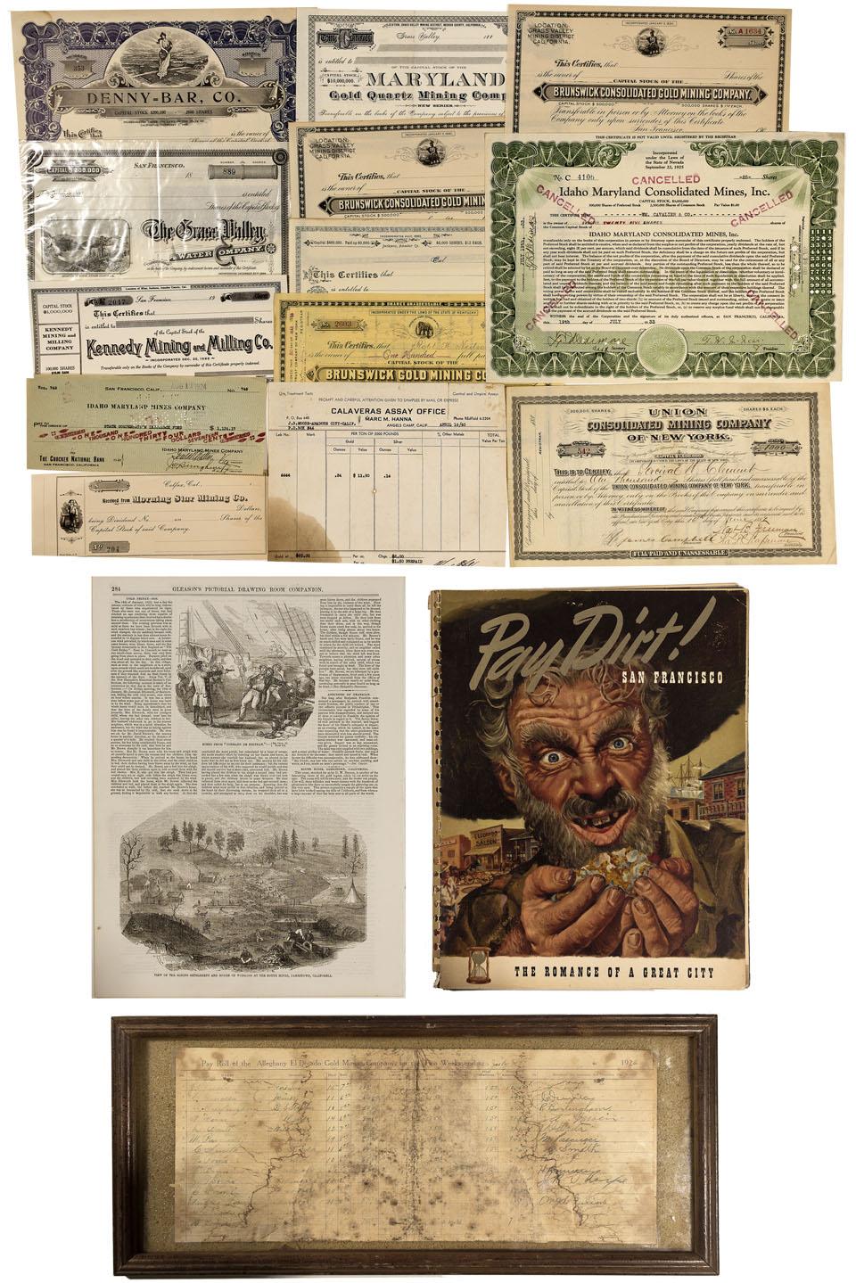 Lot of 15 items, including: 1) "Pay Roll of the Alleghany El Dorado Gold Mining Company, for the Two Weeks ending July 18, 1926," framed. Includes areas for: Names, Occupation, Days, Rate, Amount, Doctor, Total Deductions, Total Amount Due, Received the Amounts Set Opposite Our Names." Measures 17" x 7", attached to golden colored foam backing with tape, with wood back. Frame measures 21" x 9", with the right edge able to separate from the top and bottom edges. 2) Pay Dirt! San Francisco, The Romance Of A Great City, edited by Maury B. Campbell. "First Printing/Vigilante Publications/461 Bush Street, San Francisco 8, California/Lithograph by Creative Lithograph Co." Softcover, 66 pages with numerous photographs and illustrations. Measures 10 1/2" x 14", with chapters covering The Waterfront Jack London Loved, Barbary Coast, Chinatown, Wine Land. 3) Copy of Gleason's Pictorial Drawing Companion, pp. 284, which has a black and white illustration covering the bottom half of the page with a caption reading "View of the Mining Settlement and Modes of Working at the South Mines, Jamestown, California." 4) Calaveras Assay Office receipt, Marc M. Hanna (assayer), datelined Angels Camp, April 16/60. Sample 6664 from J.B. Moore-Amador City-Calif. 5) Union Consolidated Mining Company of New York, with "Location of Property, Bodie Mining District, Bodie, Mono County, California." Certificate No. 542, issued for 1000 shares on June 16, 1881. 6) The Grass Valley Water Company stock certificate. Incorporated December 20th, 1884, with "Location of Works, Nevada County, Cal.," datelined San Francisco, 18__. 7) Maryland Quartz Mining Company stock certificate, incorporated May 14th, 1880. Datelined Grass Valley, 188_, with "Location, Grass Valley Mining District, Nevada County, California." printed above it. 8) Industrial Mining Company stock certificate, incorporated July, 1890. Datelined Cal., 189_, "Jackson, Amador Co." printed at center top. 9) Brunswick Consolidated Gold Mining Company, incorporated January 11, 1890. "Location, Grass Valley Mining District California" printed at top left. Datelined San Francisco, 190_. 10) Kennedy Mining and Milling Co. Stock certificate, incorporated Dec. 22, 1886. Datelined San Francisco, 19__, with "Location of Mine, Jackson, Amador County, Cal. 11) Denny = Bar, Co. Stock certificate, incorporated under the laws of the State of California, February 7, 1900. Datelined Etna, Cal. 12) Idaho Maryland Consolidated Mines, Inc., datelined San Francisco, 1933. Incorporated under the laws of the State of Nevada, September 22, 1925. Cancelled by stamp, property located in Grass Valley, CA. 13) Dividend check, blank, received from Morning Star Minin Co., datelined Colfax, Cal. 14) Brunswick Gold Mining Company, certificate no. 2603 for 100 shares. Incorporated under the laws of the State of Kentucky, datelined New York, 1889. 15) Idaho Maryland Mines Company check datelined Aug, 1924. Issued from The Crocker National Bank, paid to the State Compensated Insurance Fund.