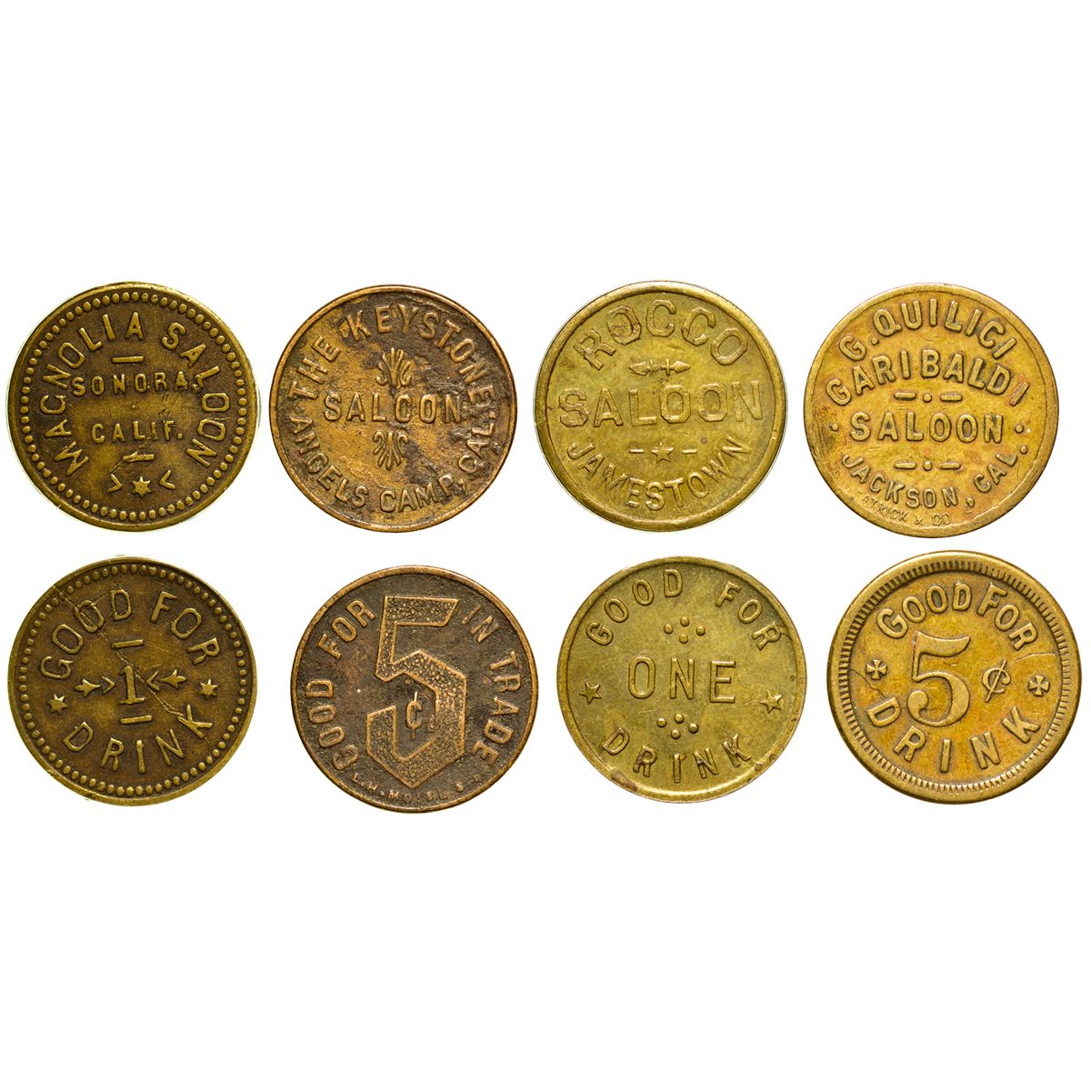 Lot of 4. 1) Jamestown, Rocco Saloon GF1D. XF. 2) Jackson G. Quilici, Garibaldi Saloon. GF5cD. VF. 3) Angel's Camp, Keystone Saloon. GF5cIT. Dug, VG. 4) Sonora, Magnolia Saloon. GF1D. VF. Jamestown has one of the last still operational railroad roundhouses in America. It was built in 1897 [railtown1897.org].