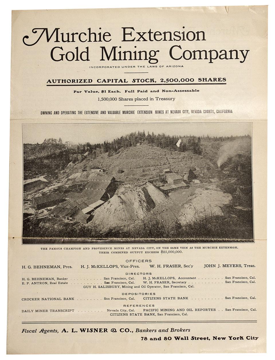 An eight page prospectus from the Murchie Extension Gold Mining Company, incorporated in Arizona 1906. Authorizing 2,500,000 shares of capital stock. Highlighted points include: "The Famous Champion and Providence Mines at Nevada City, on the Same Vein as the Murchie Extension. Their combined Output Exceeds $25,000,000. Also lists officers and fiscal agents (Wall Street address). Topics discussed include: Properties, Engineers Report, Milling of Ore, Trust Fund Guarantee, and Endorsements. Measures 9" x 12", with images of the California, Idaho, Murchie, Great North Star, Pennsylvania, Home, Empire, Champion, and Providence mines noted on each page.