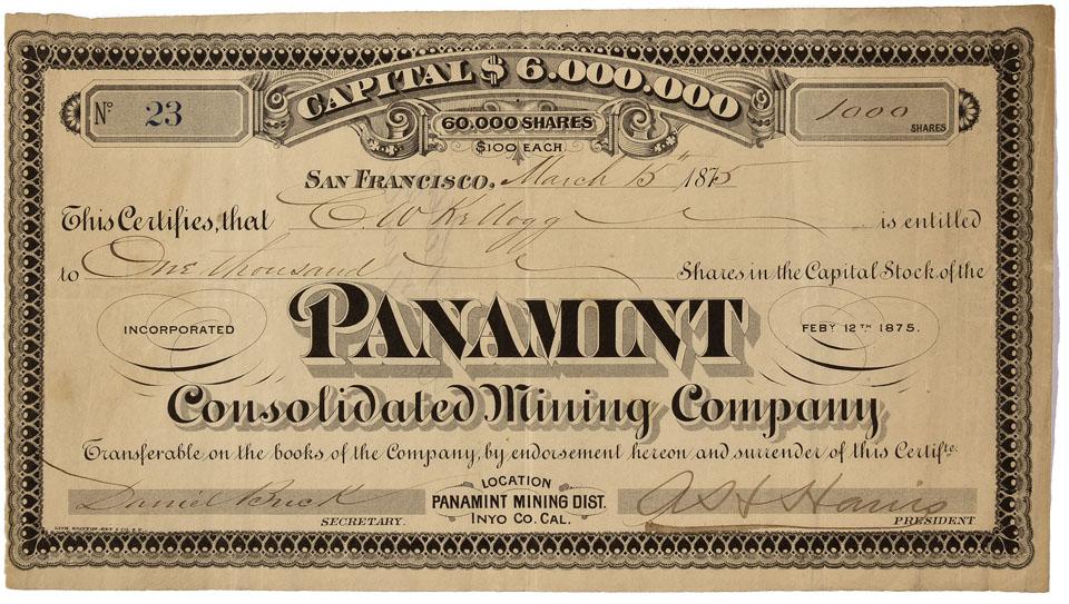 The Panamint Consolidated Mining Company was established in the early 1870’s by two Nevada senators, J. P. Jones and William Stewart, who were heavy investors in Virginia City, Nevada mines.  It was located outside of Panamint City, which is now a ghost town, and was incorporated on February 12th, 1875. C. W. Kellogg, to whom the certificate was issued, was a Union major in the Civil War. The following is an excerpt from the Saturday, January 9, 1875 "Napa Register" quoted (http://www.ghosttowns.com/states/ca/panamintcity.html) “In this district [the Panamint Mines] are noted for the immense richness and width of the ledges on the surface. How they will hold out at a considerable depth is problematic, none of the mines being developed to a depth of more than fifty or sixty feet, at which depth they hold good. It is the opinion, however, of many mining experts that they will be permanent to a great depth. Among the principal mines are Jacob's Wonder, now being worked, the company employing some twenty-five or thirty men in the mine and around their mill. They have a small five-stamp mill for concentrating the metals, which will be sent to San Francisco or some other point to be reduced. The mill is expected to commence running in a short time. Stewart's Wonder is another promising mine, but not worked at present. The Wyoming, Venus, and Great Sunrise are being worked. The Mountain View, Esperanza, Hemlock, Panamint, and Hudson River are among the prominent claims which are lying idle at present. There are numerous other mines in this district of great promise, but being held by men of small means are not developed sufficiently to attract much attention".