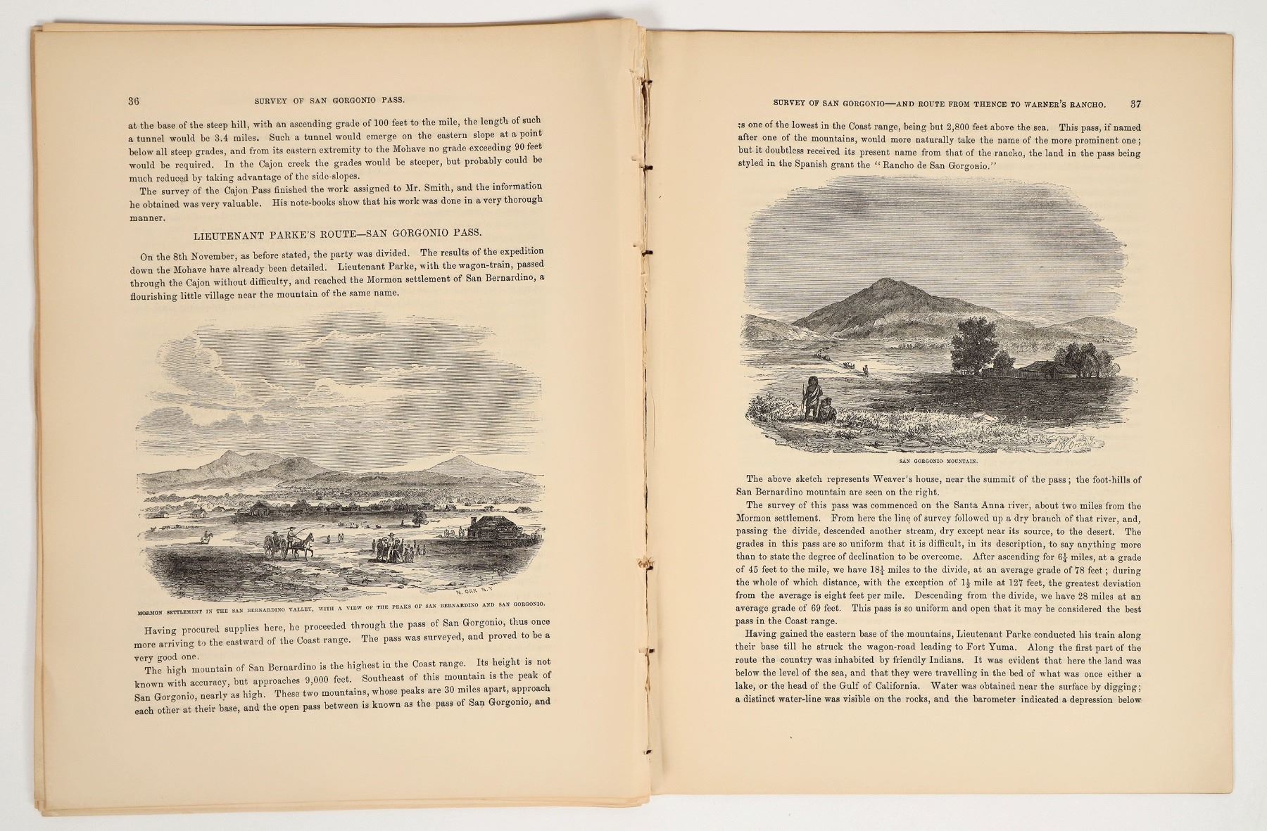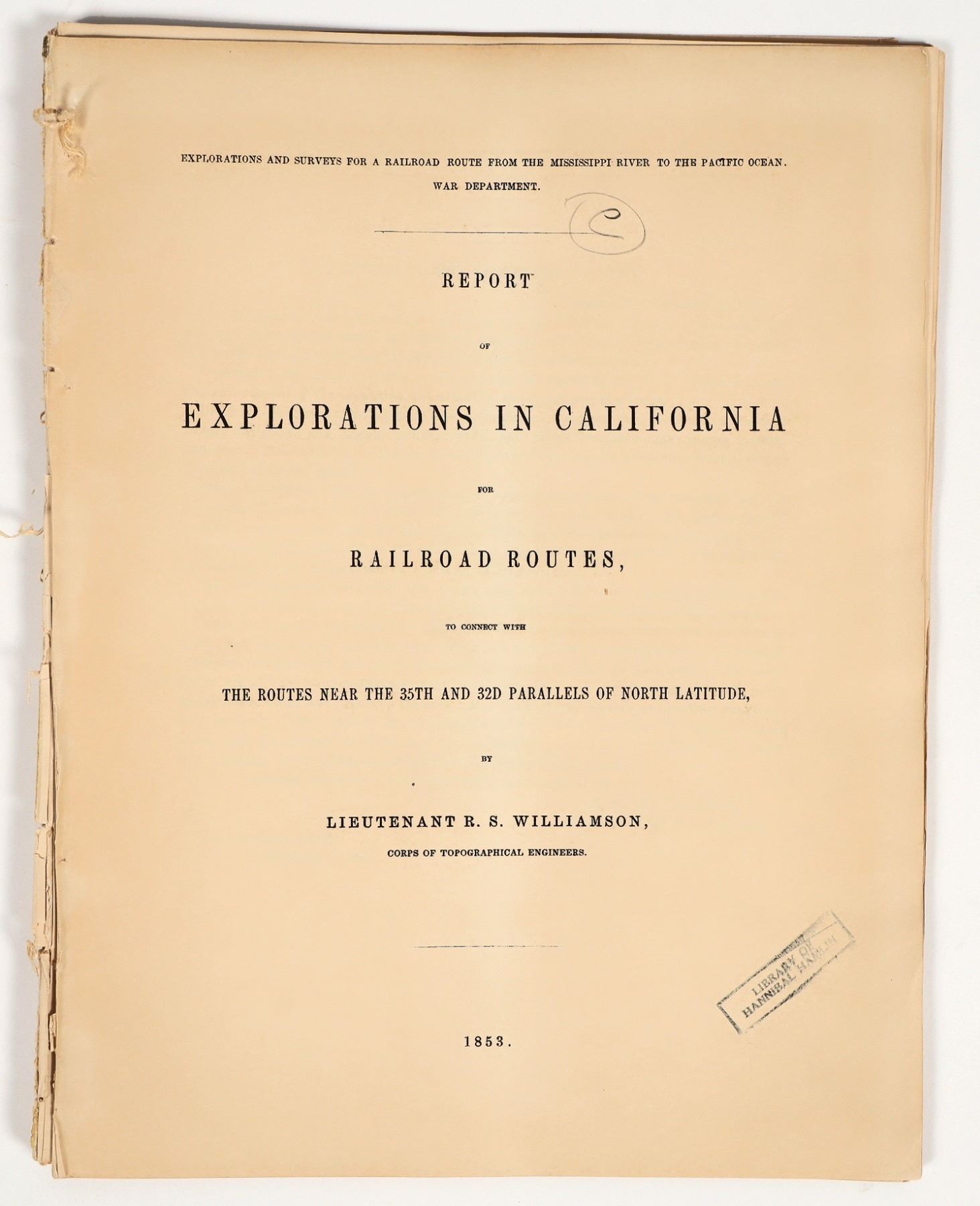 A copy of "Report of Explorations in California for Railroad Routes, to connect with the routes near the 35th and 32nd parallels of North Latitude" by Lieutenant R.S. Williamson of the Corps of Topographical Engineers. Published 1853 as part of "Explorations and Surveys for a Railroad Route from the Mississippi River to the Pacific Ocean" from the War Department. 43 pages, unbound, illustration of men on horseback at Livermore's Pass at rear. Approx. 9"x11". See photos.