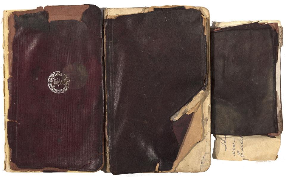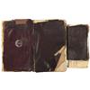 Lot of 3. 1) Mahogany leather bound personal diary. Both front and back covers are no longer in tact with the contents. About the first 10 pages are filled out; possibly a list of items that had been purchased. The last five or so pages have lists of different names. 3 1/2" x 5 3/4". Poor condition. 2) Deep Mahogany leather bound business diary. Due to moisture, the ink on the first few pages have bled, and the cover is in poor condition with tears and folds. Almost each page has been filled out with lists of items that may have been sold, such as "can of milk, cheese, loaf bread, yeast cakes, and grey flannel". Dated 1901-1902. No indication of location. 3 1/2" x 5 3/4". 3) Very small leather fraternal code booklet. This book was found with the Eureka Lodge book #22. Contains only about 15 pages or less. Book had been exposed to moisture which turned the edges of the pages pink and bent the cover. 2 1/4" x 3 3/4". Fair condition.