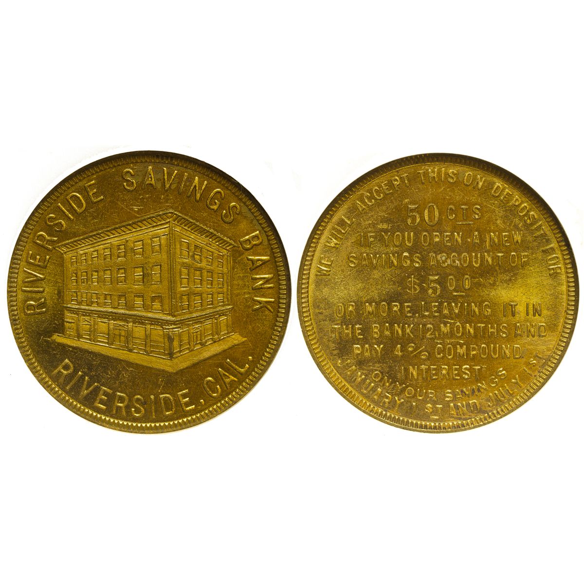 This piece from Riverside savings Bank will pay you 50 cents if you open a new account and leave a minimum of $5 in the account for 12 months. Piece is in very good to excellent condition.