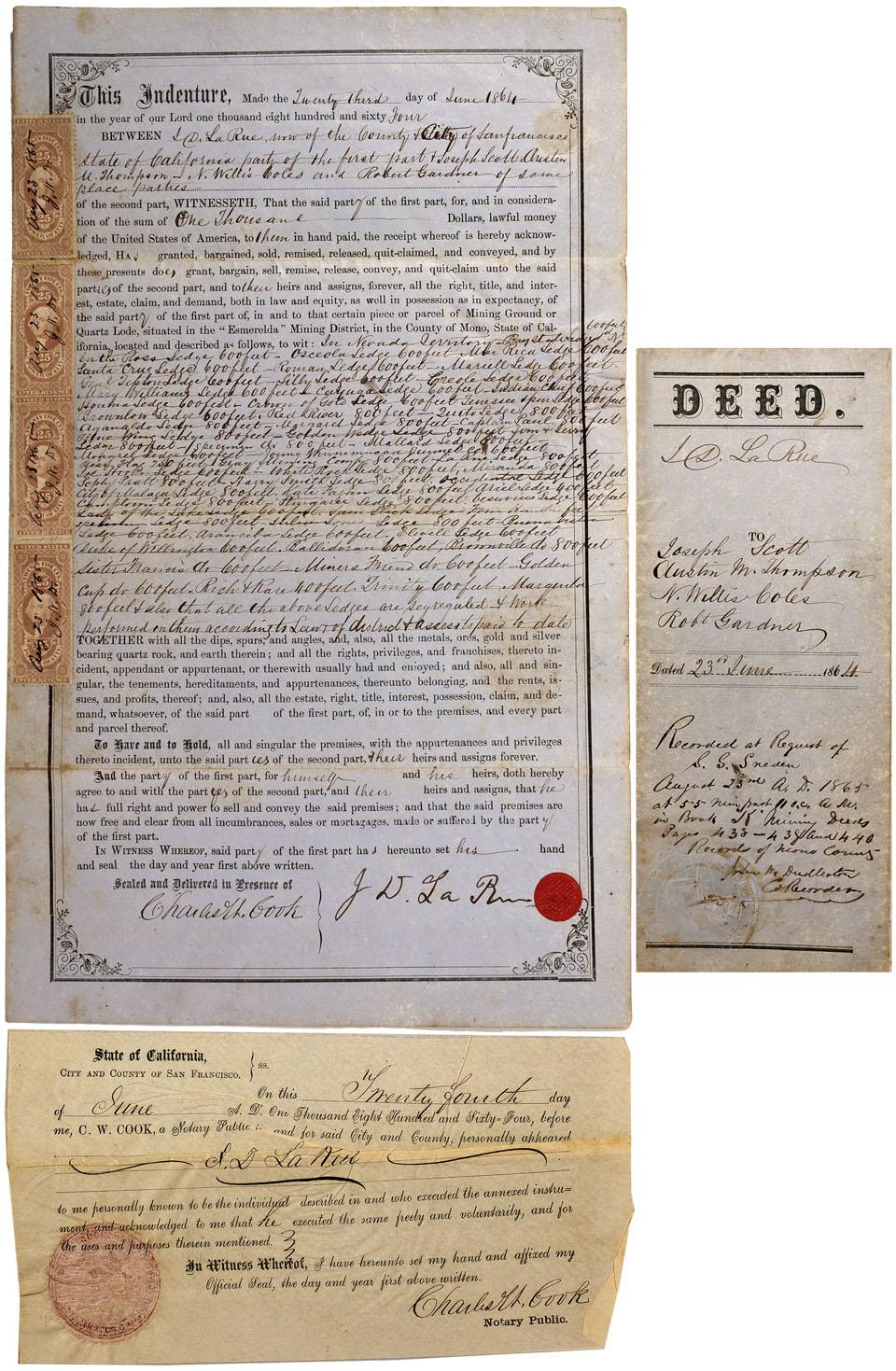 On 23 June, J. D. LaRue sold Scott Austin, M. Thompson, J. N. Willis Coles, and Robert Gardner his mining property in Nevada Territory. The sales price was $1,000.00. There are several different properties listed in this agreement with their measurements. For example, the group of men bought 600 feet in the Ross ledge, 800 feet of the Red River, 600 feet of the Brownlow ledge, 600 feet of the Rich and Rare, and so on. The document was recorded at the request of S. S. Sneden on 25 August 1865 at about 11 AM in book "K" of Mining Deeds, pages 438 and 440 of Mono County, CA by John N. Dudleston, the county recorder. Also affixed are 4 adhesive 25 cent, R 48, R 4, partially perf., Power of Attorney U. S. Revenue stamps. The middle two are attached horizontally. All are manuscript cancelled, tied. Some yellowing in the folds and foxing. Good condition.