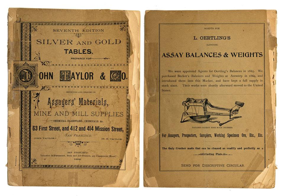 Seventh edition, "Silver and Gold Tables, Prepared for John Taylor & Co. Importers and Dealers in Assayers' Materials, Mine and Mill Supplies, Chemical Glassware, Chemicals, &c." Address of "63 First Street, and 412 and 414 Mission Street, San Francisco" below title on cover. Printers: San Francisco, Valleau & Peterson, Book and Job Printers, 425 Commercial Street, 1894." Softcover, 46 pages, including several interesting advertisements and illustrations. Prepared by Taylor & Co. Properties of Silver and Gold and Notes to Silver and Gold Tables included. The preface notes that "The Gold Table is calculated to half fineness, which will be found of great convenience to many," while it also states that "We think other desireable articles will be found described on looking through our illustrated catalogue (mailed free on application). Being in daily communication with the leading foundries here, any information about mining machinery will be freely given, prices will be submitted and orders placed if desired on the best terms. See our list of text books; many new ones are added. John Taylor & Co." Measures 7" x 9 1/4", with front and back covers secured by tape. Much of right and left edge of front cover has been removed, along with the right edge of the title page. Both the right and left edges of the back cover are also missing. Aside from that, the pages themselves are very fine.
