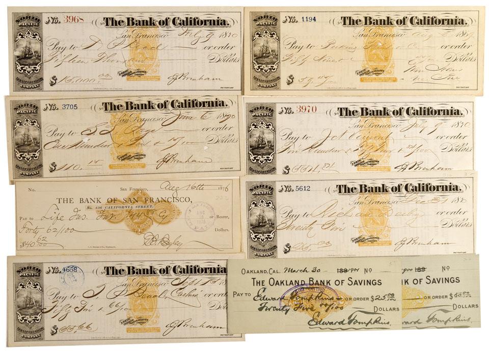 Lot of 9. Six checks (1-6) Bank of California, North Pacific Transportation Co. All have revenue stamp RN-B17. 1) #1194 issued August 3, 1869 to Perkins Flint & Co. for $59.47. 2) #3705 Issued June 6, 1870 to S.L. Page for $110. 3) #3968 issued July 9, 1870 to ?.P Beach for $15. 4) #3970 issued July 9, 1870 to J.N. Vinmont for $554.84. 5) #4658 issued September 13, 1870 to I.P. Beach for $55.66. 6) #5612 issued December 31, 1870 to Rich and Derby for $25. 7) Unnumbered check drawn on the Bank of San Francisco on August 16, 1876 payable to Life Insurance Int for $40.62. Has revenue stamp Rn-C1. 8 & 9) Two unnumbered checks drawn on The Oakland Bank of Savings on March 30, 1902 payable to Edward Thompkins: August 22, 1900 for $50 and March 30, 1901 for $25. Both have revenue stamp RN-X7.