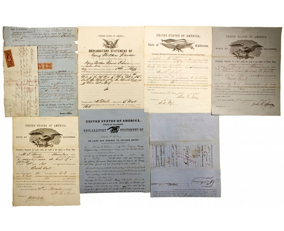 Lot of seven declaratory statements with regards to homesteads of one quarter section parcels (160 acres).Counties where the land transactions took place includes Stanislaus, San Francisco, San Joaquin and Tehama Counties. Some of the documents are a bit fragile, but still intact. Others in very good condition.