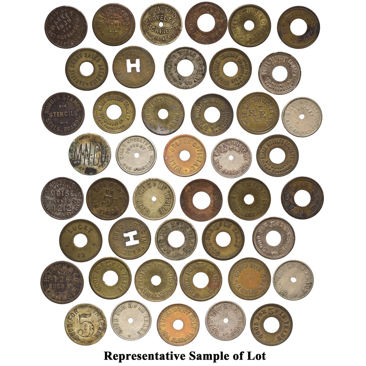 Lot of 97. Includes, 43 from Mills Novelty. 16 from Moise- Klinker. 14 from Royal Novelty. 8 from Novelty Machine Works. 8 from Patrick Novelty and Co. 2 Mills Golden Official. 1 Pacific Coast Sales Agency. 1 Bradford Novelty. 1 Automatic Machine Co. 1 Whitney Brothers. 1. Funland. 1. Thalia Amusement Co.