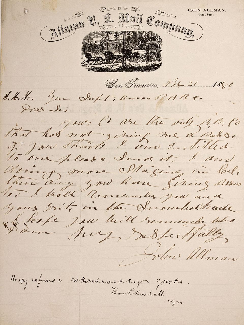 A single-page letter from Gen’l. Sup’t. John Allman to the Gen’l. Supt. of the Union Pacific Railroad, requesting that he be given a pass. The letterhead contains a nice vignette of a stagecoach with six horses racing through pine trees. The company offered service from Duncan’s Mill to Mendocino City, Cloverdale to Novarro Ridge, Calistoga to Lakeport, and Marysville to Grass Valley. A printed note on the reverse explains the company’s daily routes in detail. Datelined San Francisco. Measures 7 ½" x 10 ½.”