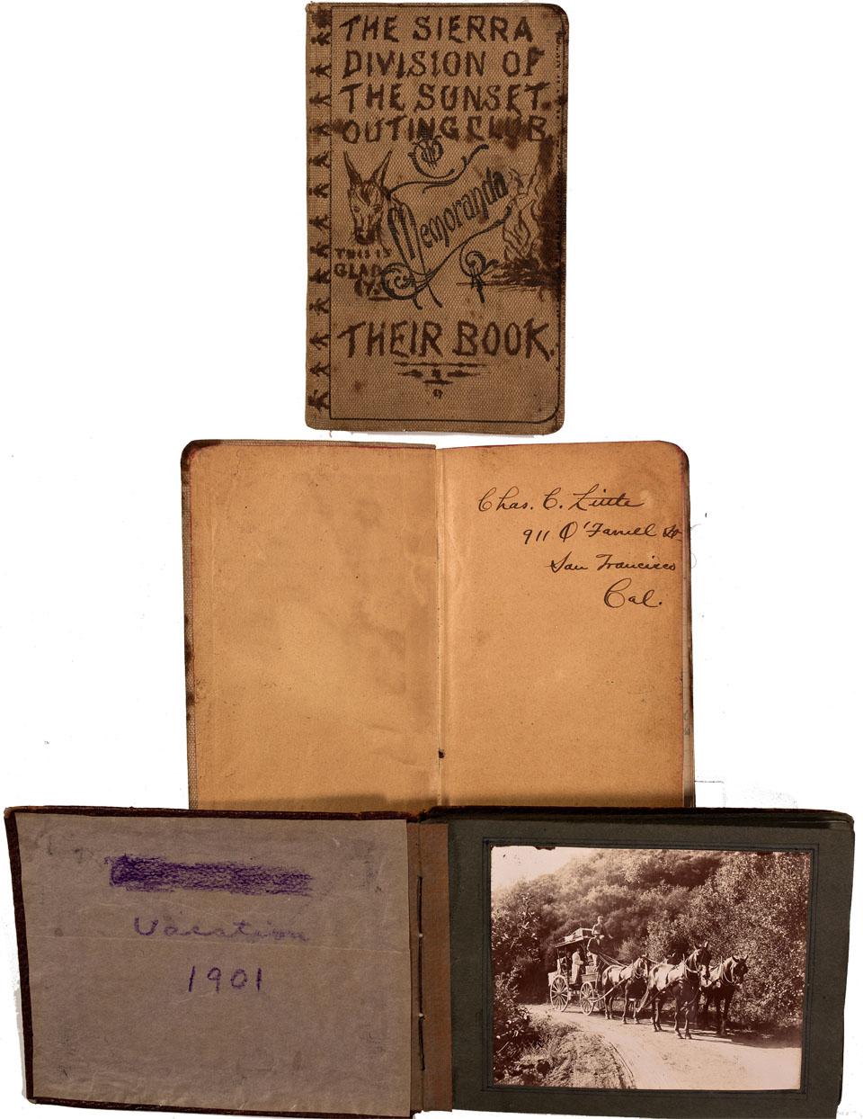 Lot of 2. 1) Diary of "The Sierra Division of the Sunset Outing Club." "Memoranda" stamped with fancy ornament on burlap cover. Datelined on page 7 as May 26, 1905. Starts with supply list of goods. Entries written in pencil by Chas C. Little. 2) Album dated 1901 "Vacation" (written in purple crayon). Includes photographs of open carriage stopped on the trail, scenic mountains and lakes, men canoeing. Album is mostly filled with only 4-6 pages unused. Album is tight and is bumped at top and bottom of spine. First page of diary is loose but in tact. Yellowing of inner leaf and first page. Rest is in fine condition with good legibility of writing.
