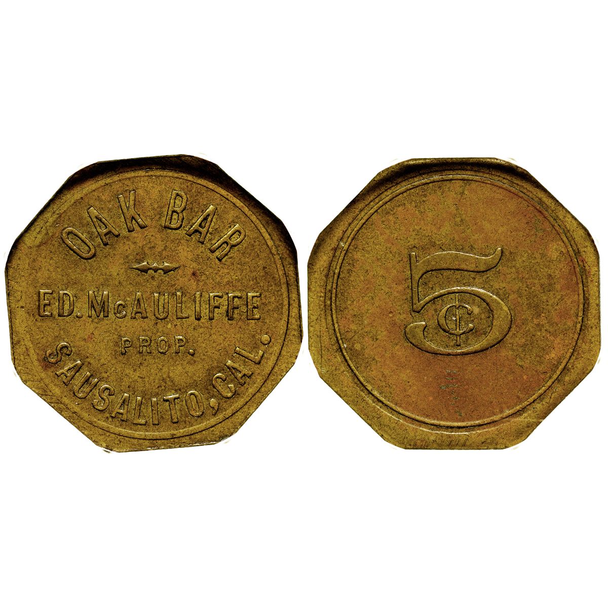 "Oak Bar, ED. McAuliffe." GF 5c. Genuine #5210198-042. Rare