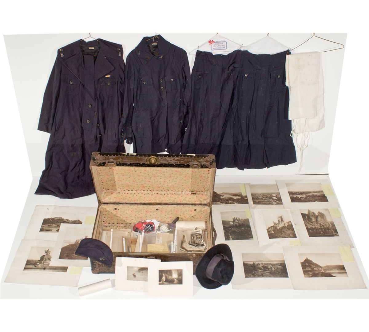 Large trunk, labeled US Army Nurse Corp belonging to one Elsa Goldmann (from Santa Clara). Inside is a full Nurse`s uniform, along with a huge collection of photos, post cards, war department ephemera, pamphlets, letters, panorama photos, literally hundreds of WW1 memorabilia items. There are unit insignia patches, foreign coins, a German belt buckle, buttons, pins, beads, linen nurse`s folding cap, newspaper clippings, military magazines, and many German tourist items on the Rhine, history, etc. This is only a minor description of the myriad items contained in the Oppenheimer trunk. The trunk itself measures 31 x 17 x 13. There is also a portfolio with 11 BW prints of various German cities, castles, statures, and the Rhine river. In this set are 4 small religious prints of life transitions. All the captions on the prints are in German. A real treasure trove of WW1 history for the collector. HKA#63949